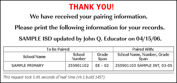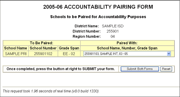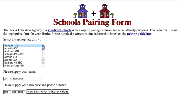Districts are given the opportunity to use the same pairing relationship they used in the prior year or to select a new relationship by completing special data entry screens on the TEA website. (See samples that follow.) In late March, districts with campuses that needed to be paired received instructions on how to access this on-line application. Pairing decisions were due by April 28, 2006.