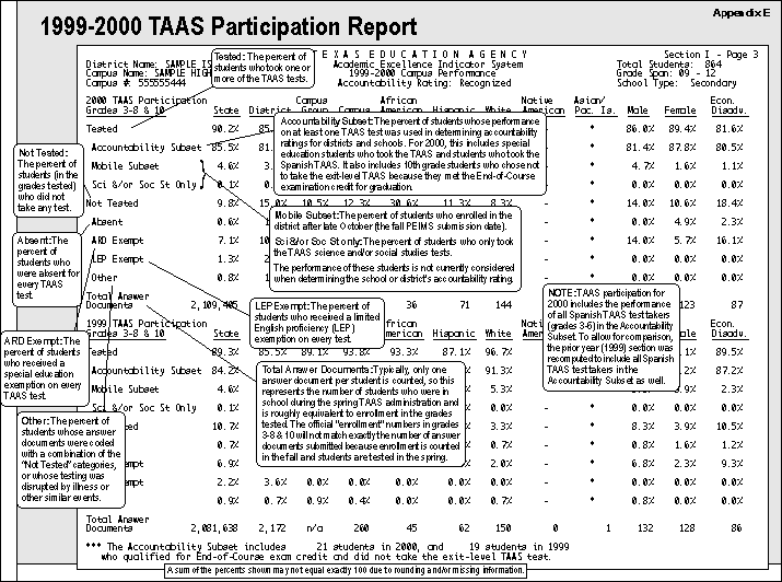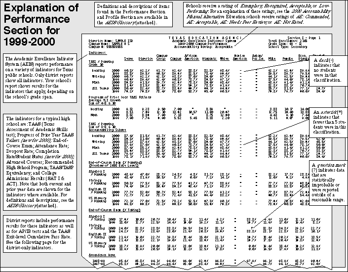 Accountability Rating: This refers to the district and campus ratings assigned by the 2000 accountability system. Districts and campuses are evaluated on performance on the TAAS, the dropout rate, and the attendance rate. The four levels of ratings are: