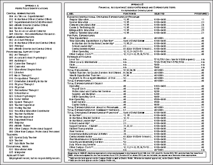 Auxiliary Staff (District Profile only): This shows the Full-Time Equivalent (FTE) count of staff reported without a role but with a PEIMS employment and payroll record. Counts of auxiliary staff are expressed as a percent of total staff. For auxiliary staff, the FTE is simply the value of the percent of day worked expressed as a fraction. (Source: PEIMS, Oct. 1999)