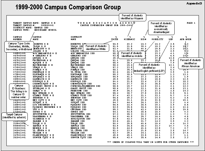 All schools are first grouped by type (elementary, middle, high school, or multi-level). Then the group is determined on the basis of the most predominant features at the target school. In the attached example (Appendix D, page 1) the target school (Sample H S) has 7.6% African American, 36.8% Hispanic, 53.9% White, 28.2% economically disadvantaged, 10.7% limited English proficient, and 23.7% mobile students. Of these features, the most predominant (i.e., the largest percentage) is the percent of White students, followed by the percent of Hispanic students, the percent of economically disadvantaged students, the percent of mobile students, the percent of limited English proficient students, and finally, the percent of African American students. The following steps illustrate the group identification process: