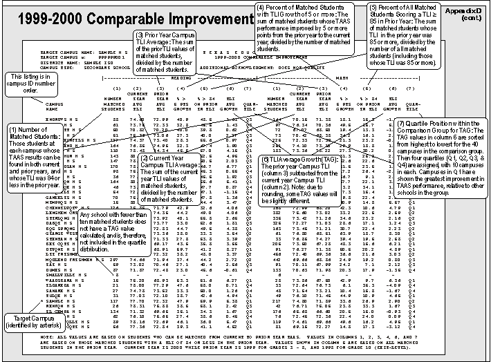 TLI Average Growth (TAG) - Calculation of Comparable Improvement for a particular school is based on the growth in the students' Texas Learning Index (TLI) scores on the TAAS reading and mathematics tests given from one year to the next.