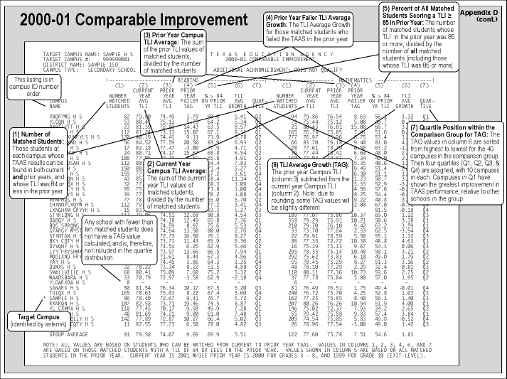 TLI Average Growth (TAG) - Calculation of Comparable Improvement for a particular school is based on the growth in the students' Texas Learning Index (TLI) scores on the TAAS reading and mathematics tests given from one year to the next.