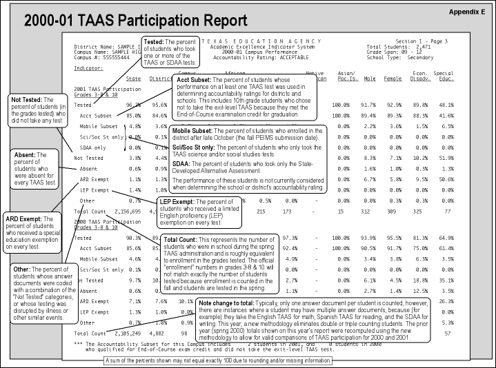 The TAAS Participation Report, included with the AEIS report, shows what percent of a district or school's test takers made up the Accountability Subset. Also see Mobile Subset, TAAS, and TAAS Participation Report.