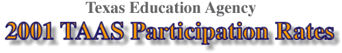 The reports available from this website provide a breakdown of a school or district's TAAS (spring 2001) participation in the tested grades. For a description of the different parts of the report, see the AEIS Glossary.