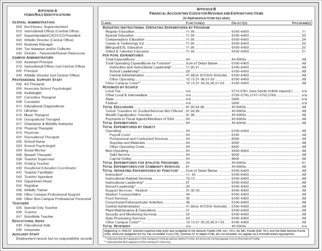 Auxiliary Staff (District Profile only): This shows the Full-Time Equivalent (FTE) count of staff reported without a role but with a PEIMS employment and payroll record. Counts of auxiliary staff are expressed as a percent of total staff. For auxiliary staff, the FTE is simply the value of the percent of day worked expressed as a fraction. (Source: PEIMS, Oct. 2001)