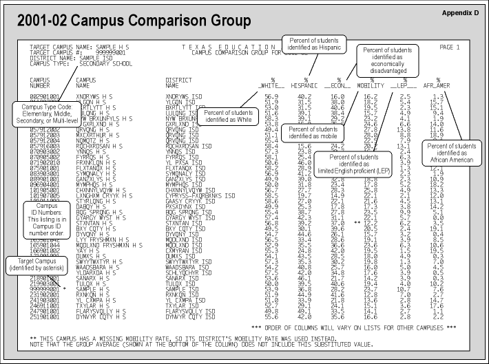 All schools are first grouped by type (elementary, middle, high school, or multi-level). Then the group is determined on the basis of the most predominant features at the target school. In the attached example (Appendix D, page 1) the target school (Sample H S) has 7.6% African American, 36.8% Hispanic, 53.9% White, 28.2% economically disadvantaged, 10.7% limited English proficient, and 23.7% mobile students. Of these features, the most predominant (i.e., the largest) is the percent of White students, followed by the percent of Hispanic students, the percent of economically disadvantaged students, the percent of mobile students, the percent of limited English proficient students, and finally, the percent of African American students. The following steps illustrate the group identification process:
