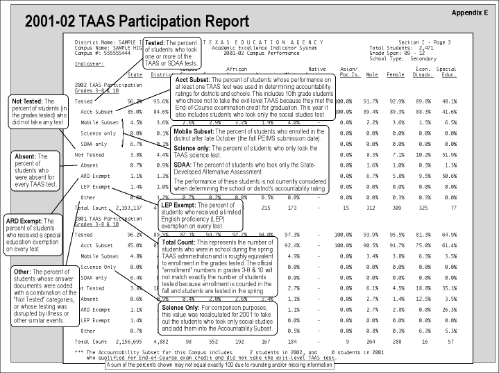 Only test takers who were enrolled in the district as of the last Friday in the previous October are included. This means that, for example, a student who moved into the district a week before the TAAS was given would not be included in the performance for that district or campus or any other, for accountability rating purposes. However, the results for students who move from school to school within the same district are used for accountability purposes. The test results are attributed to the school where the student was tested last.