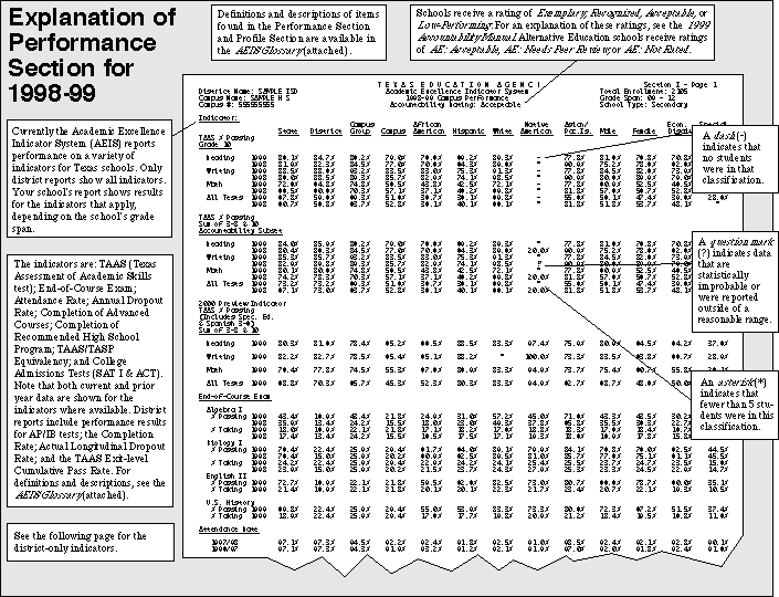 For a more detailed explanation of the accountability system, see the 1999 Accountability Manual. A copy of the manual was provided to each superintendent and principal in April 1999. It is also available on the Division of Performance Reporting's website at http://www.tea.state.tx.us/perfreport. For a detailed explanation of the accountability system used for alternative education schools, see the 1998-99 Accountability Procedures for Alternative Education Manual, available from the TEA Office of Accountability and Accreditation.