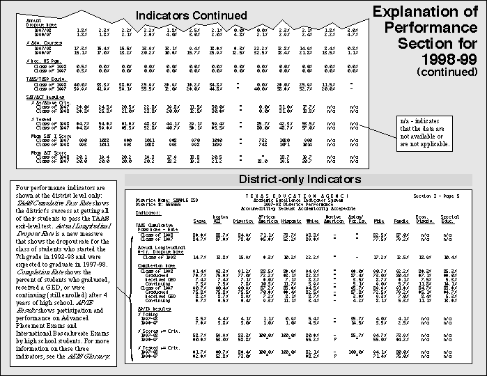 This indicator is provided on district reports only. For purposes of year-to-year comparison, information is provided for students taking examinations in the 1997-98 and 1998-99 school years. (Sources: Educational Testing Service, a College Board contractor; The International Baccalaureate Organization, and PEIMS, Oct. 1998, Oct. 1997)