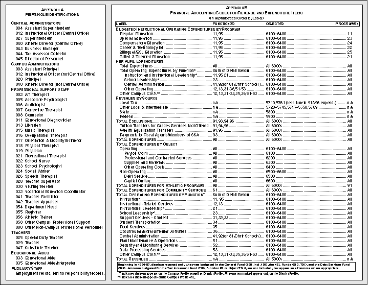 Auxiliary Staff (District Profile only): This shows the Full-Time Equivalent (FTE) count of staff reported without a role but with a PEIMS employment and payroll record. Counts of auxiliary staff are expressed as a percent of total staff. For auxiliary staff, the FTE is simply the value of the percent of day worked expressed as a fraction. (Source: PEIMS, Oct. 1998)
