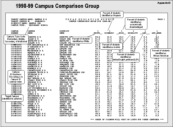 All schools are first grouped by type (elementary, middle, high school, or multi-level). Then the group is determined on the basis of the most predominant features at the target school. In the attached example (Appendix D, page 1) the target school (Sample H S) has 7.6% African American, 36.8% Hispanic, 53.9% White, 28.2% economically disadvantaged, 10.7% limited English proficient, and 23.7% mobile students. Of these features, the most predominant (i.e., the largest percentage) is the percent of White students, followed by the percent of Hispanic students, the percent of economically disadvantaged students, the percent of mobile students, the percent of limited English proficient students, and finally, the percent of African American students. The following steps illustrate the group identification process: