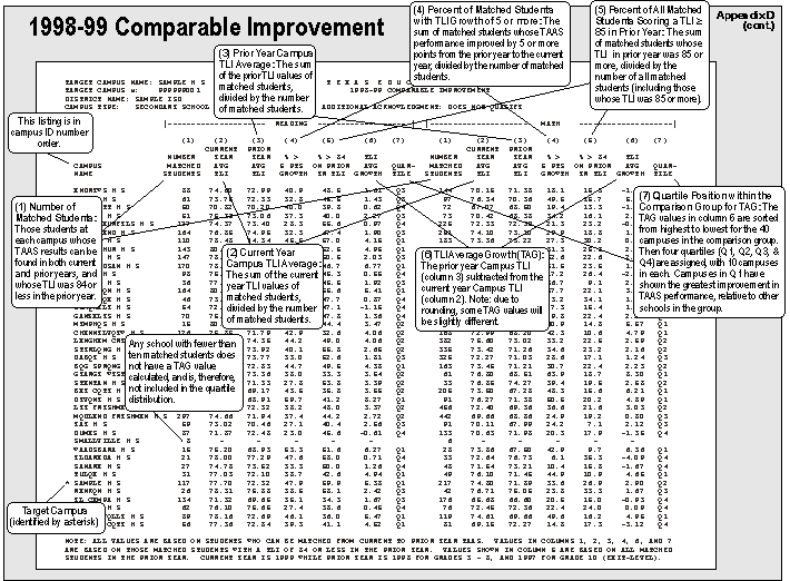 Comparable Improvement: Comparable Improvement (CI) is a measure that shows how student performance on the TAAS test has changed (or grown) from one year to the next, and then compares that growth to that of the 40 schools that are demographically most similar to the target school.