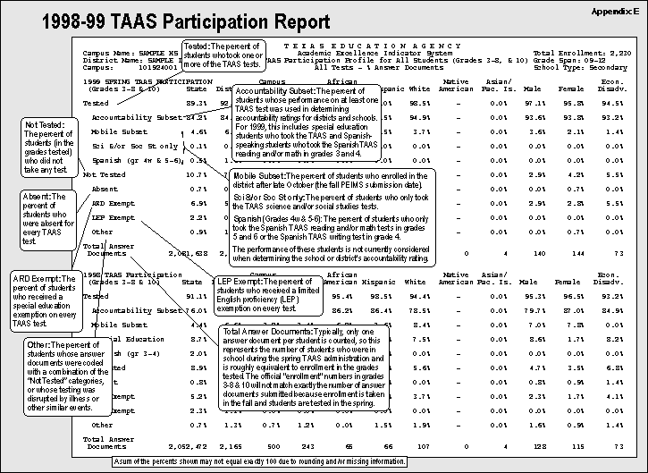 Only test takers who were enrolled in the district as of the last Friday in the previous October are included. This means that, for example, a student who moved into the district a week before the TAAS was given would not be included in the performance for that district or campus or any other. However, the results for students who move from school to school within the same district are used for accountability purposes. The test results go to the last school where the student was tested.